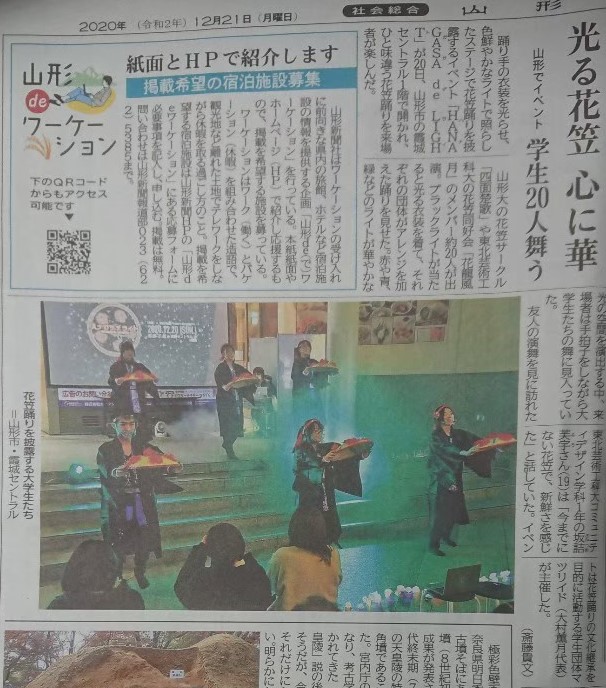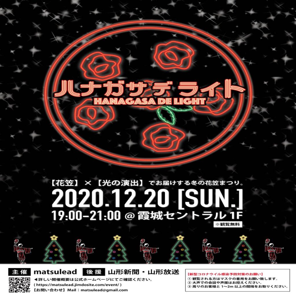 主催者として、コンテンツの企画、参加団体の各種調整、後援の交渉、SNSやラジオ出演、HP運営を含めた宣伝活動を担当。本来、「夏」・「屋外」でやる花笠踊りを「冬」・「屋内」でステージや衣装をライトアップしながら行うことで、新しい開催様式の提案を行った。当日は大雪で公共交通機関の混乱がありながらも100人以上の方にご来場いただき、高校生へ向けたオンラインライブ配信も行った。